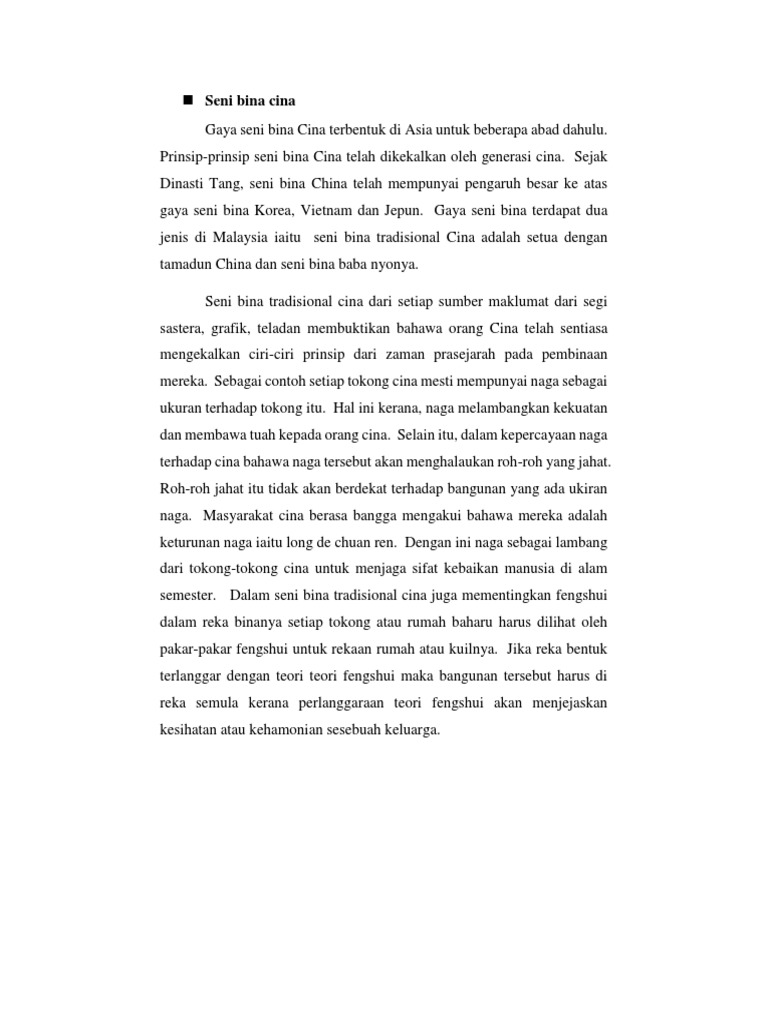 Identiti seni bina di Britain pada akhir kurun ke-19 diketengahkan agar dapat dijadikan pengajaran. - Bentuk muzik Cina yang wujud tidak terbilang jumlahnya dan aktiviti penciptaan muzik Cina yang awal melibatkan kegiatan di istana perayaan rakyat dan peristiwa yang berkaitan dengan agama. Seni bina Cina di Malaysia terdiri daripada dua jenis iaitu tradisional dan Baba-Nyonya.